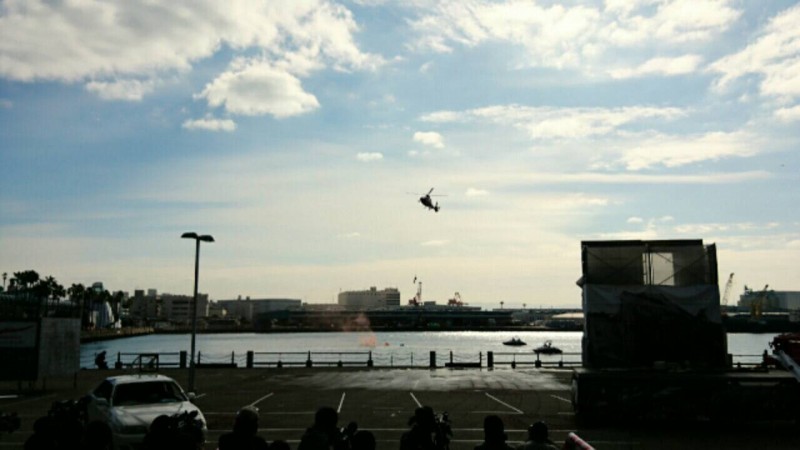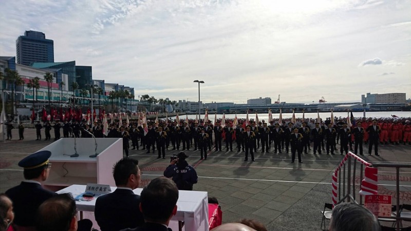 式は、消防ヘリコプター・消防艇・消防車両などの機械部隊の分列行進、市民によるパレードや消防隊員の徒歩行進、さらに陸・海・空が一体となった消火・救助総合訓練が展開され、フィナーレには消防車と消防艇による一斉放水が行われました。